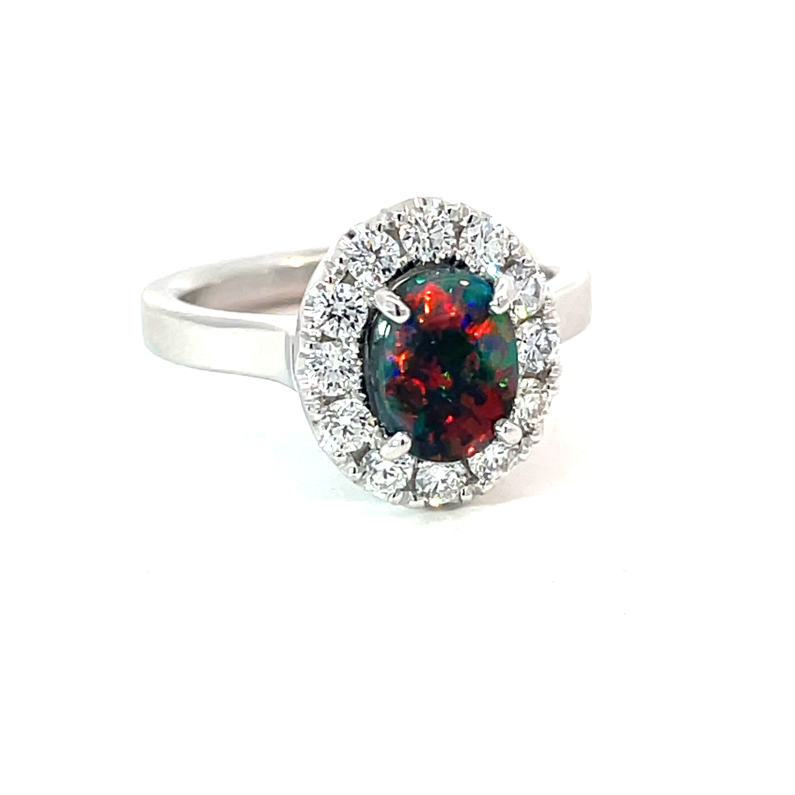 Featuring a solid Lightning Ridge Black Opal with a striking red and green pinfire pattern. The opal is claw set and surrounded by a halo of cut claw set white diamonds. This classic setting is supported with a flat upswept band with an under-rail.